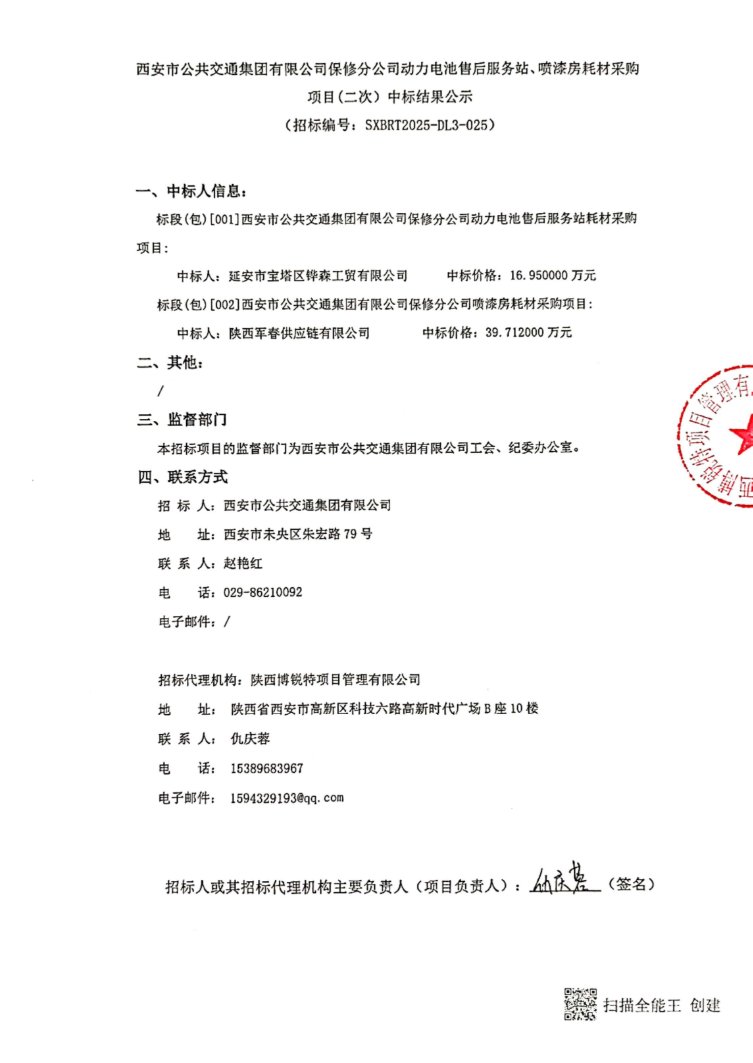 西安市公共交通集团有限公司保修分公司动力电池售后服务站、喷漆房耗材采购项目(二次)中标结果公示